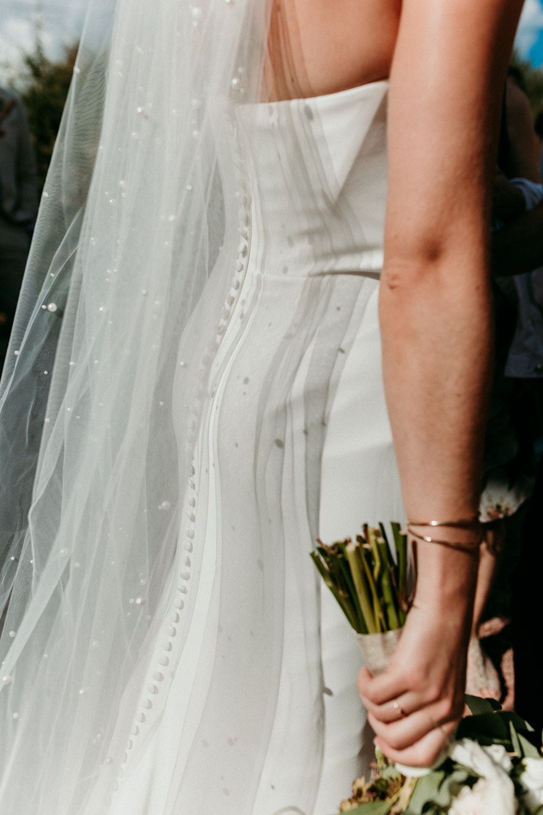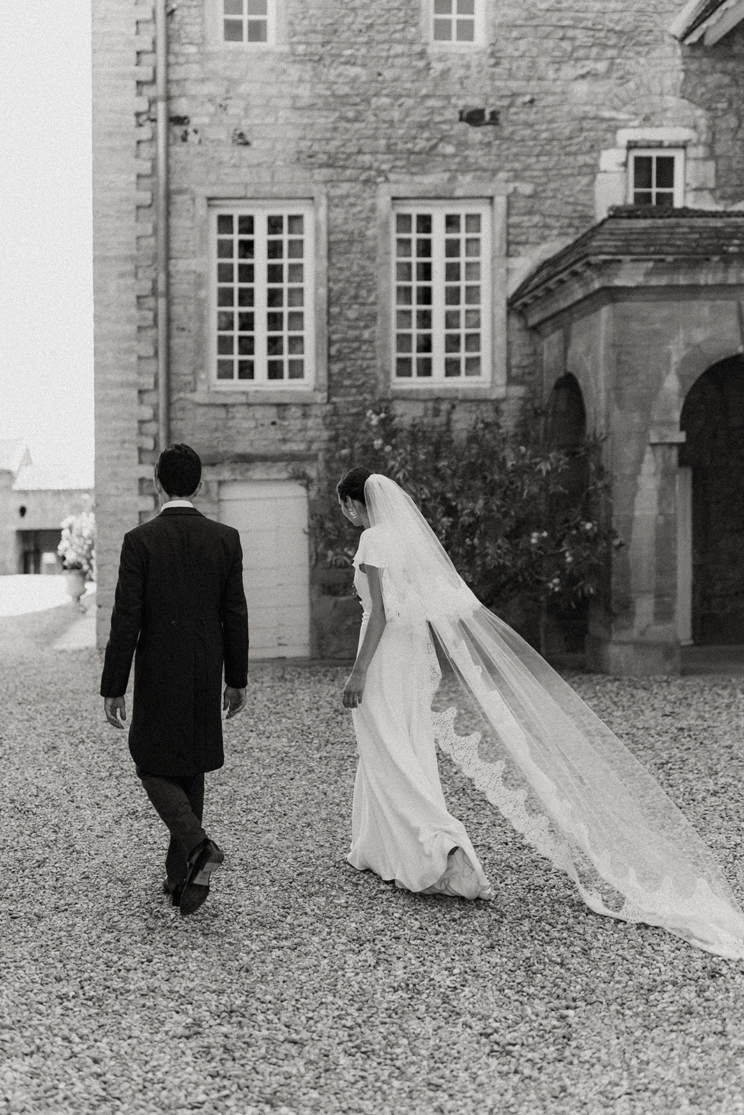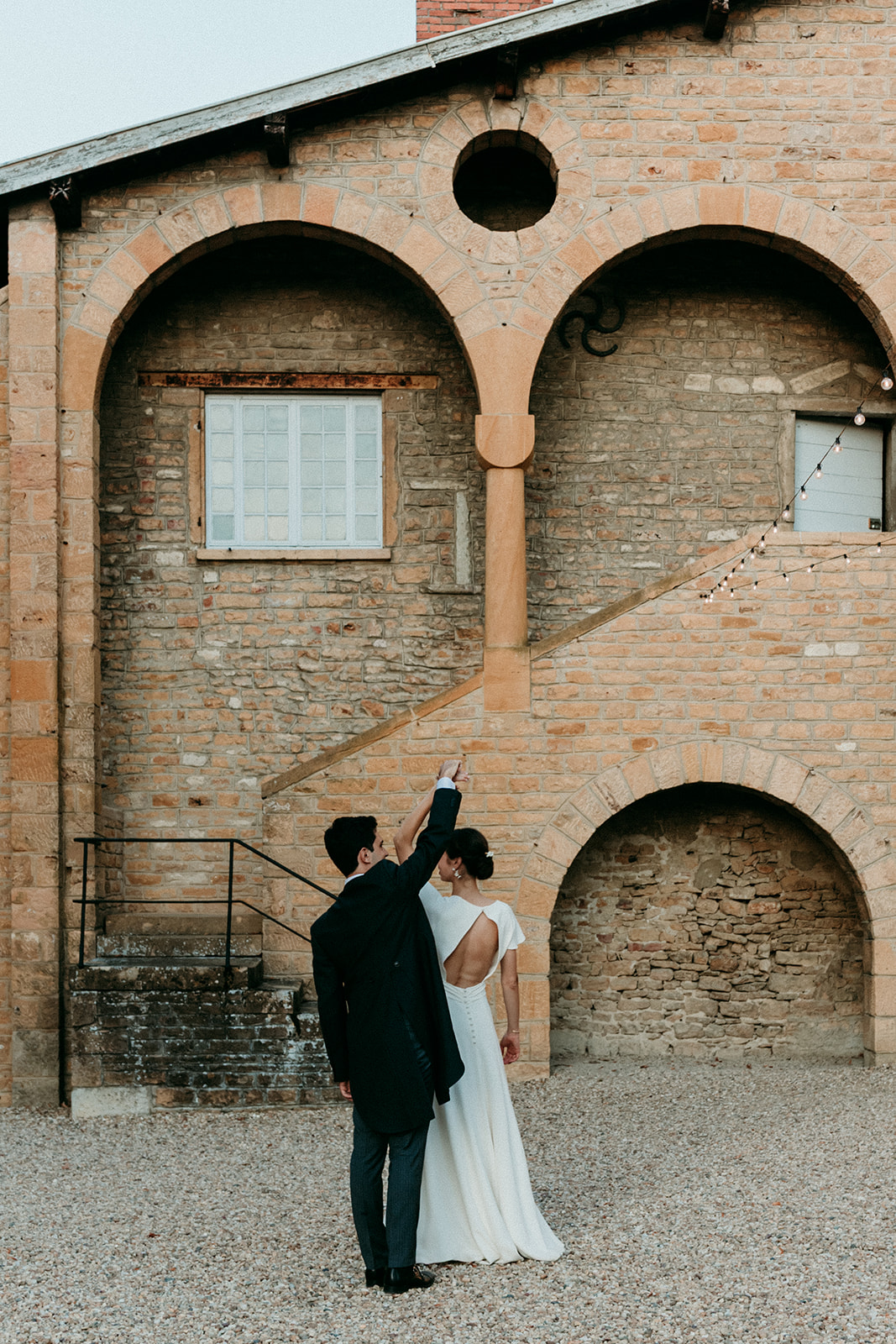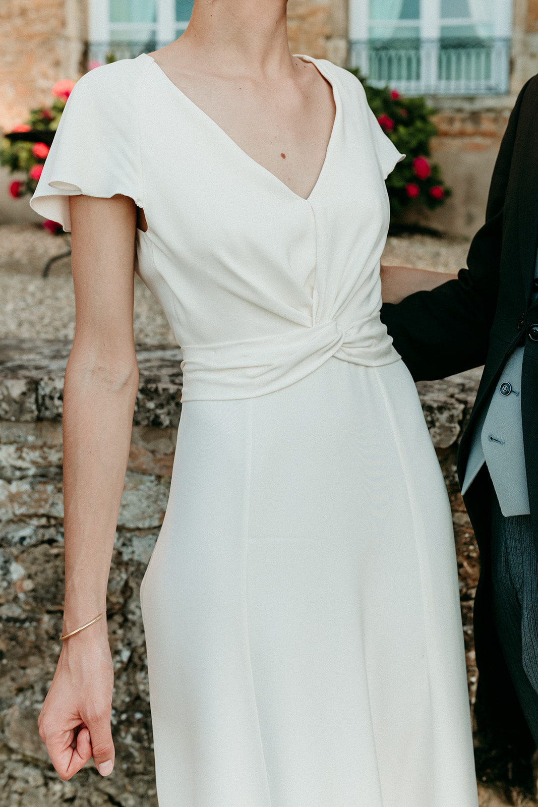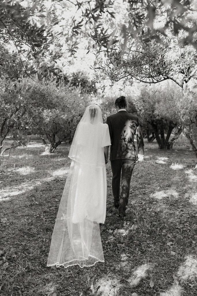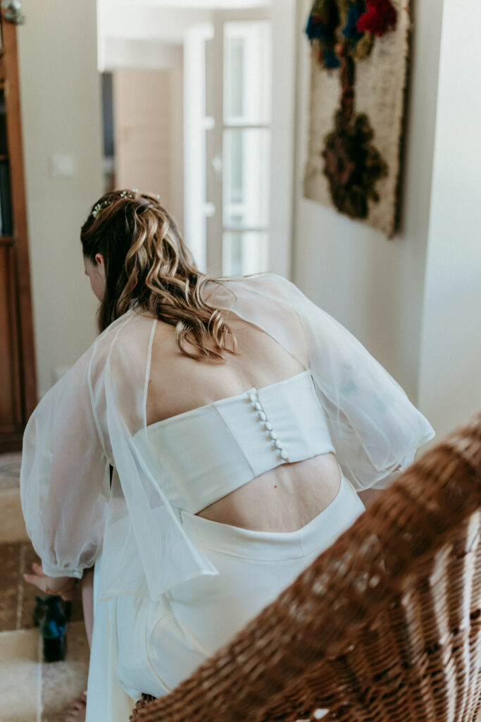 mariée de dos, donne main à son mari. dos nu, robe fluide